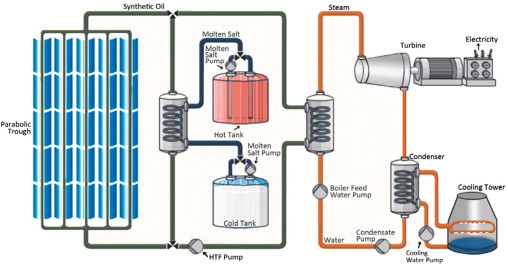 In a tower type solar plant, a wide variety of HTF can be used, from air to any fluid that can be heated. Currently, the most common HTF is steam, molten salt or air.