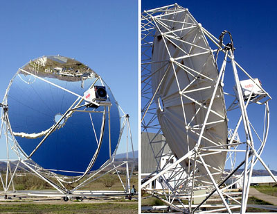 This technology uses a Stirling engine, a device which works with heat as fuel. The parabolic dish concentrate the sunlight in a point directly to the Stirling engine, which drives an alternator to generate electricity.