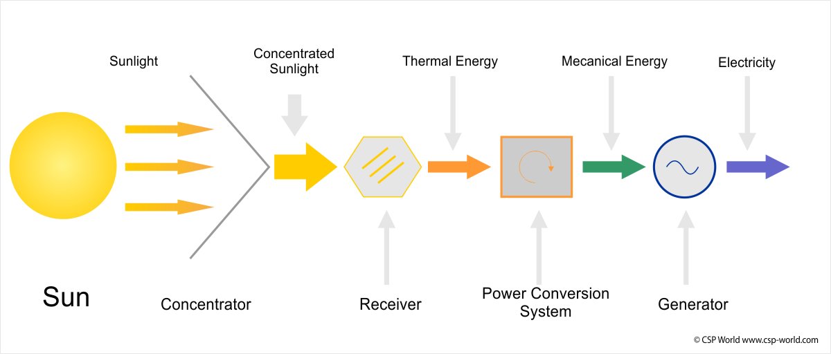 CSP is based on concentrating the direct normal irradiation (DNI) from the sun to a point or a line to get thermal energy (heat).