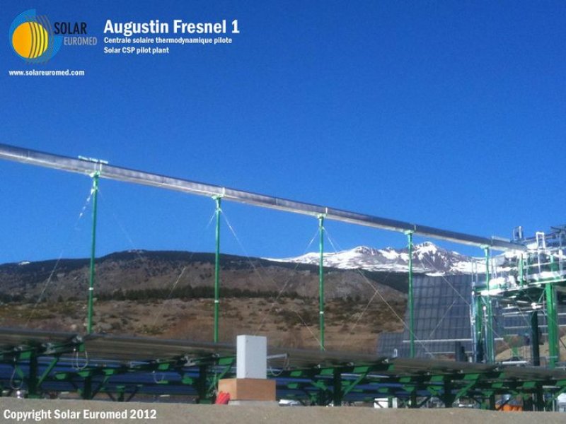 GroupGeneral InfoOwner/s: Solar EuromedTechnology: FresnelCountry: FranceStatus: OperationalPurpose: DemonstrationPower: 0.25 MWStart date: September, 2012Location: Themis, TargassonneLand area: 1 hectares TechnologySolar fieldSolar Collector Assemblies Fresnel: Solar Euromed AF1Mirrors / Reflective surface: Solar Euromed AF1Number of lines: 1Line length: 40 mNumber of mirrors across line: 12Reflecting area: 400 m²Heat Collector Element (Tube): Solar Euromed AF1Receiver type: Non-evacuatedHeat Transfer Fluid: WaterHTF Temp out: 300ºCPower blockStorage Y/N: YesStorage type: Ruths tankStorage: 0.25 HoursPower cycle: Steam RankineCooling: DryPower (net): 0.25 MW Companies involvedProject developer: Solar EuromedEPC: Solar EuromedO&M: Solar EuromedKey components suppliers: Solar Euromed SocioeconomicsConstruction Employment: 10 jobs-yearO&M employment: 3 annual jobsFinancing: French Goverment Co-funding OtherSolar resource: 1 800 kWh/m2/yrSolar resource source: Meteo stationOther info: Augustin Fresnel 1 solar power plant is co-financed by the European Union and the European Regional Development Fund