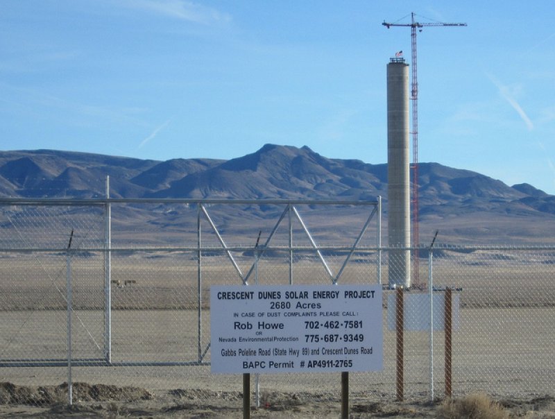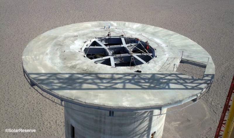 GroupGeneral InfoOwner/s: SolarReserveTechnology: Central receiver (power tower)Country: USStatus: Under constructionPurpose: CommercialUsage: ElectricityPower: 110.00 MWConstruction start date: September 2011Start date: January, 2014Location: Tonopah, NevadaGeneration: 500.00 GWh TechnologySolar fieldMirrors / Reflective surface: FlabegHeliostat aperture: 62 square meterNumber of heliostats: 17,170Reflecting area: 1 071 361 m²Central receiver: Pratt & Whitney RocketdyneReceiver type: External - cylindricalHeat Transfer Fluid: Molten salts - sodium and potassium nitratesHTF Temp in: 287ºCHTF Temp out: 565ºCTower height: 164 meter (540 ft)Power blockStorage Y/N: YesStorage type: two tank direct - Molten saltsStorage: 10.00 HoursPower cycle: Steam RankinePower cycle pressure: 115 barTurbine: Alstom MT Companies involvedProject developer: SolarReserveEPC: CobraO&M: SolarReserveKey components suppliers: FlabegAlstomSuppliers details: Pratt & Whitney Rocketdyne (Technology provider)Nabtesco (Solar traking drive)Flowserve (Pumps)Flabeg (Mirrors)Alstom (Turbine)IDOM (Basic and Detailed engineering of Power Block and Salt System)BEROA (Tower construction) SocioeconomicsCost: 800 million USDGeneration Offtaker: NV EnergyPPA/Tariff: 25 years PPA agreement - USD0.135 per kWhConstruction Employment: 1500 jobs-yearO&M employment: 200Financing: SantanderUS Department of Energy loan guarantee - $737 millionACS Cobra OtherSolar resource: 2 685 kWh/m2/yrSolar resource source: NRELOther info: The project is owned by Tonopah Solar Energy SLL. The technology used in the project was developed by Pratt & Whitney Rocketdyne which has licensed it to SolarReserve After Gemasolar (20 MW in Spain) this is the second large-scale plant to use molten salts as HTF and storage fluid.