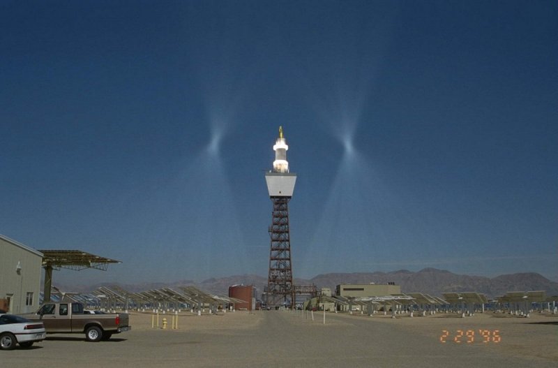 During times of high winds, blowing dust is sometimes illuminated by the reflected sunbeams to create an unusual atmospheric phenomenon in the vicinity of the power tower. These beams of light were depicted in several scenes, and a painting, in the 1987 movie Bagdad Cafe, which was filmed nearby.