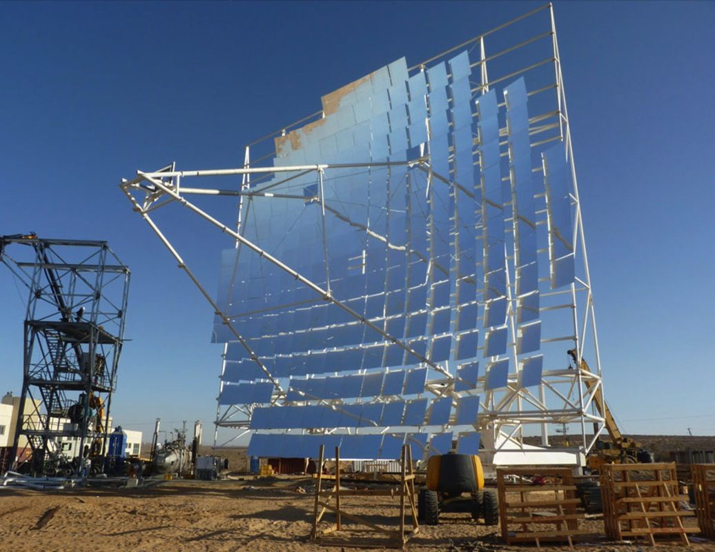 - A proprietary volumetric receiver mounted at the dish focal point that absorbs the concentrated solar radiation energy. The receiver utilizes air as heat transfer fluid, converting solar radiation energy into heat and delivering high temperature air to the relevant applications.