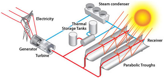 Trough plants can incorporate Thermal Energy Storage (TES) systems, it's usually done by heating molten salts which are stored in a tank. When a plant has storage system, the solar field is 'oversized' to collect enough heat for the normal operation of the plant and to heat the thermal storage medium, usually molten salt.